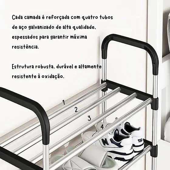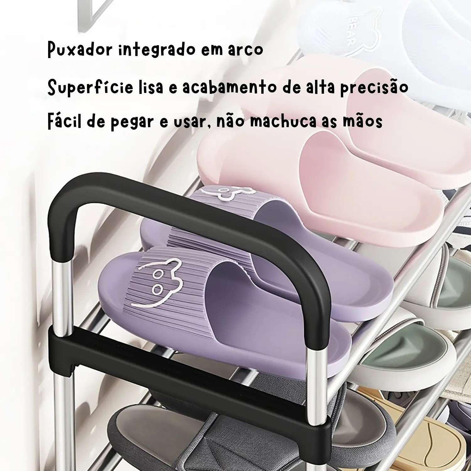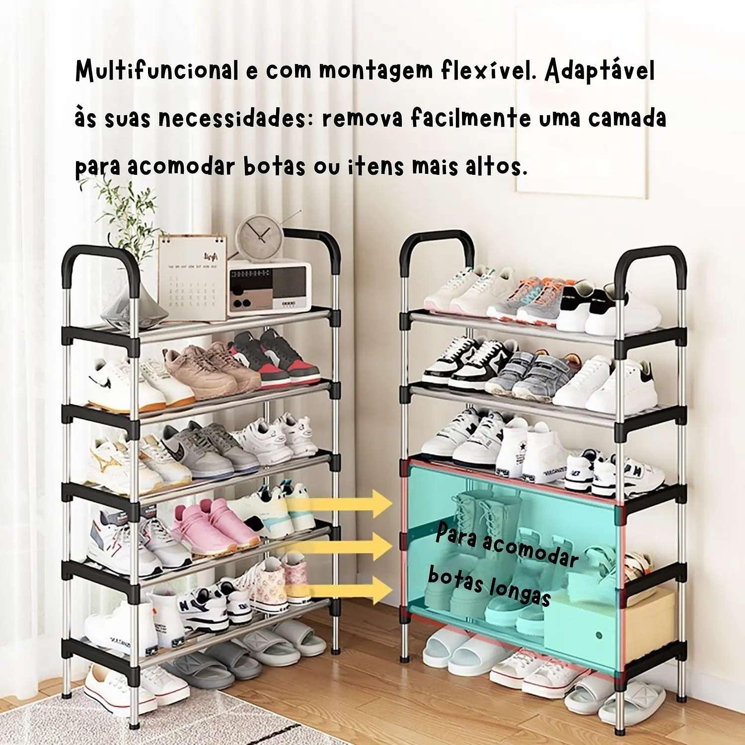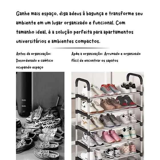Seu formato vertical aproveita melhor a altura do ambiente, otimizando o espaço disponível e mantendo todos os calçados organizados e fáceis de visualizar. Além disso, suas prateleiras são resistentes e suportam diversos tipos de sapato, desde tênis e sapatilhas até saltos e botas leves.