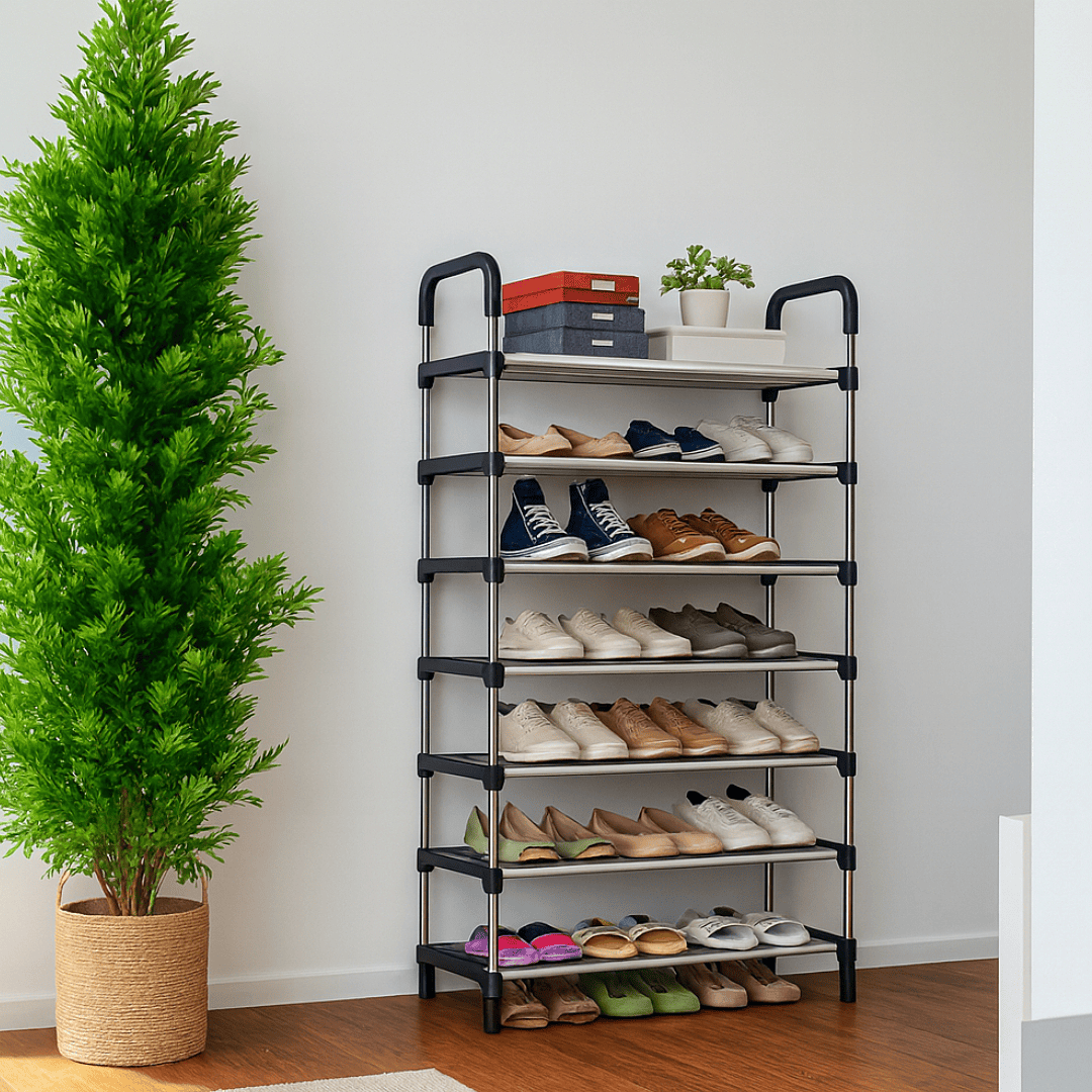A sapateira vertical com 7 prateleiras é a solução ideal para quem busca praticidade e organização no dia a dia. Com design funcional e compacto, ela permite armazenar mais de 21 pares de sapatos sem ocupar muito espaço, sendo perfeita para ambientes como quartos, closets, corredores ou até mesmo halls de entrada.