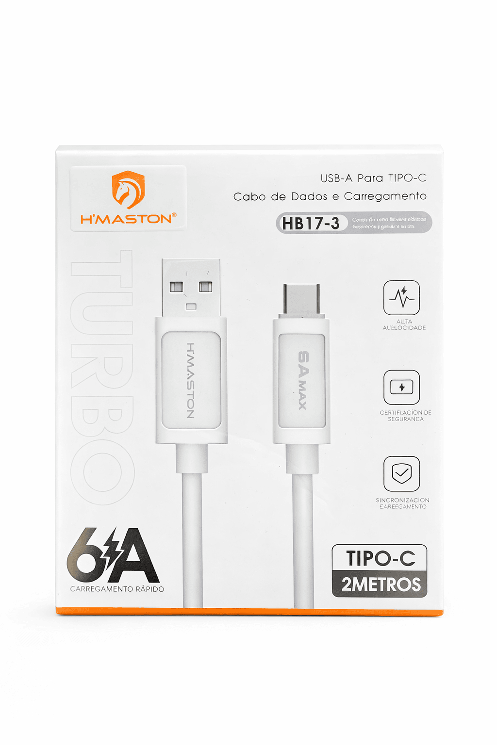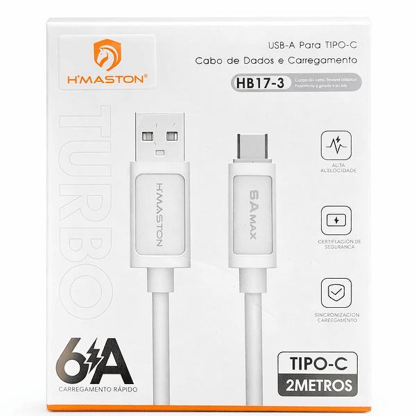 Tipo de Conector: USB-A para USB-C.Comprimento: 2 metros.Velocidade: Suporta carregamento turbo de até 6A.