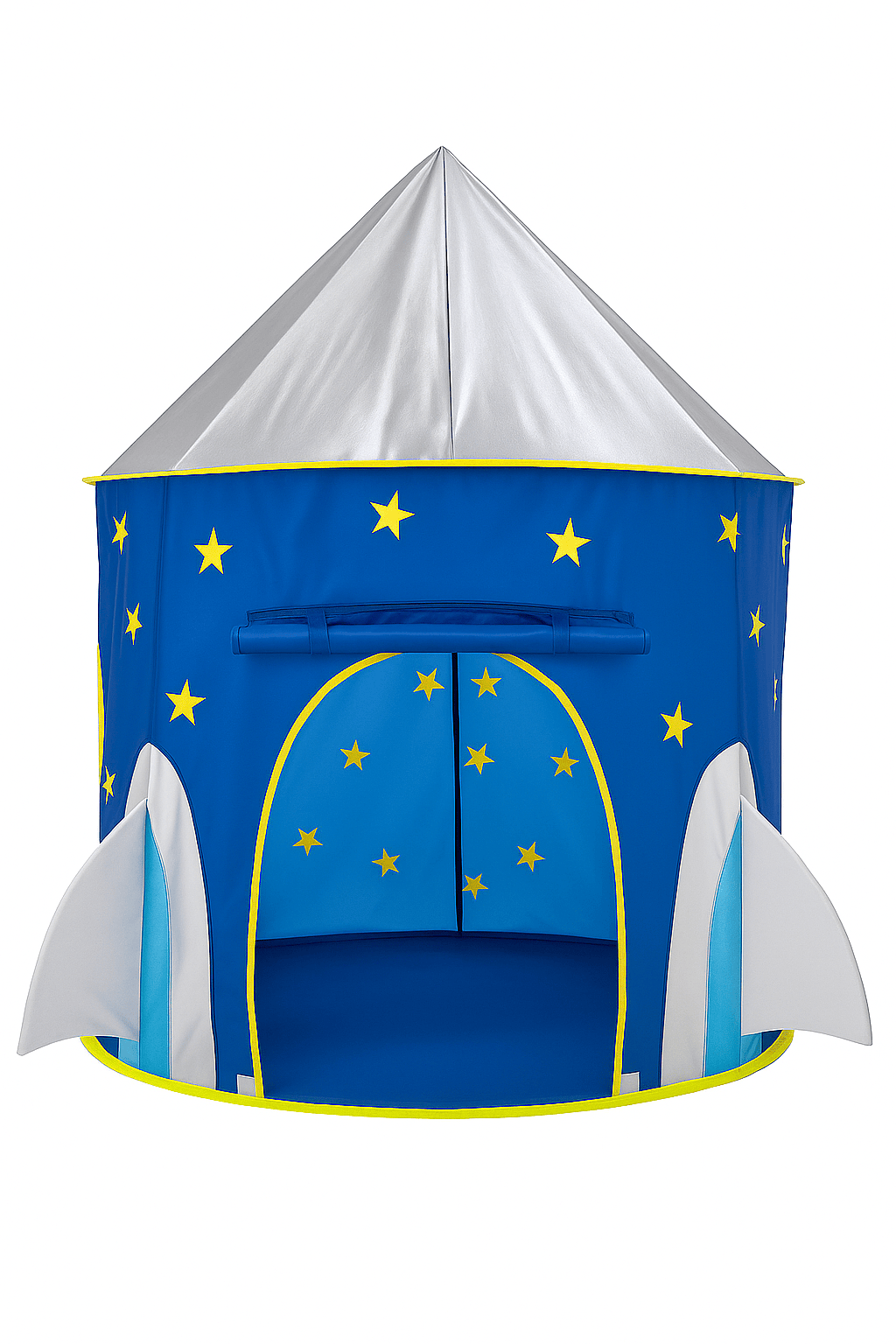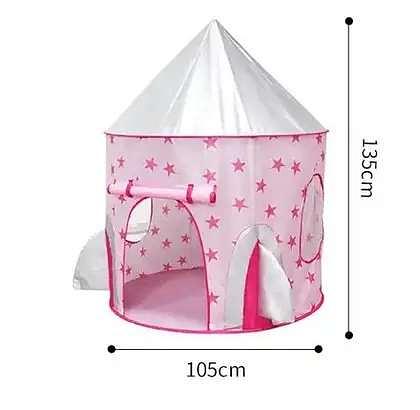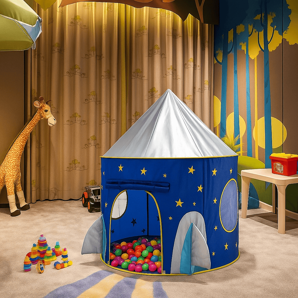 Barraca em formato de Foguete onde a criança vai adorar brincar. São flexíveis e dobradas ficam guardadas sem fazer volume na sacola plástica que a acompanha.