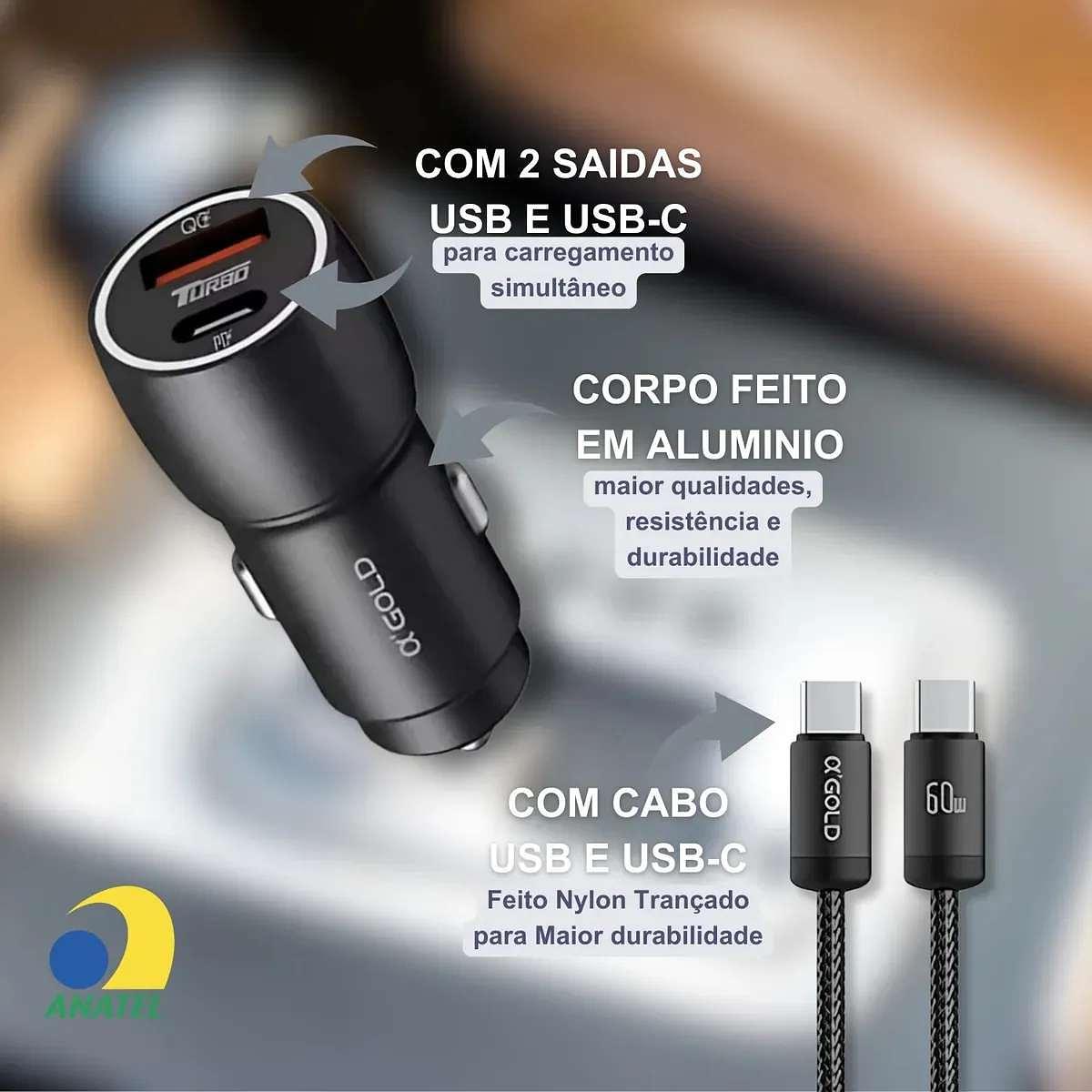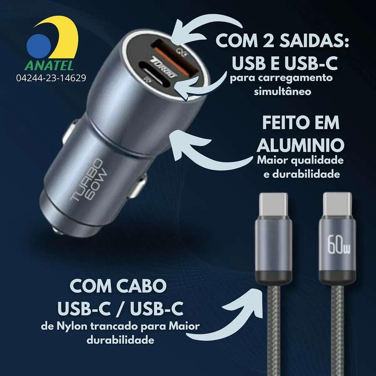 Carregador Turbo 60W USB-C – Potência e Velocidade para o Seu Dia Mantenha seus dispositivos sempre prontos com o Carregador Turbo 60W USB-C, desenvolvido para quem não pode perder tempo. Com tecnologia de carregamento rápido, ele fornece energia de forma ultrarrápida e segura, garantindo que notebooks, smartphones, tablets e outros aparelhos compatíveis estejam sempre carregados onde quer que você esteja. Principais diferenciais: Potência de 60W – carrega notebooks, celulares e tablets com máxima eficiência. Tecnologia Turbo/Power Delivery – carregamento muito mais rápido que os carregadores convencionais. Entrada universal – compatível com tomadas USB-C em veículos ou ambientes domésticos (conforme versão). Compacto e leve – design moderno e portátil para levar na bolsa ou mochila. Proteção inteligente – sistema de segurança contra sobrecarga, superaquecimento e curtos-circuitos. **Especificações Técnicas:** - Potência: 60W - Saídas: 1 Porta USB e 1 Porta USB-C - Tecnologia: Carregamento Turbo e Rápido - Cabo: Incluído, Tipo-C - Compatibilidade: iPhone, Samsung, Android e dispositivos com carregamento USB-C - Recursos adicionais: Display LED, design portátil e compacto Ideal para quem vive na correria do dia a dia e precisa de mais energia em menos tempo. O Carregador Turbo 60W USB-C é a escolha certa para quem quer performance, confiabilidade e praticidade