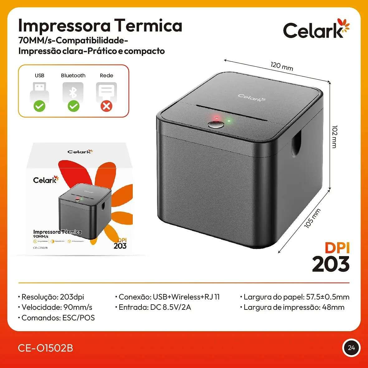 Potencialize seu negócio com a Impressora Térmica Celark CE-O1502B. Compacta, rápida e extremamente versátil, ela é a solução ideal para a impressão de cupons não fiscais, recibos de vendas, pedidos de iFood/delivery e ordens de serviço. Com conexão Dual (USB + Bluetooth), você tem a liberdade de imprimir direto do seu computador ou do seu smartphone com total praticidade. Principais Diferenciais: Velocidade Incrível: Com 90mm/s, você não deixa seu cliente esperando. Economia Real: Tecnologia de impressão térmica direta — não precisa de tinta nem tonner. Design Compacto: Ocupa pouquíssimo espaço no seu balcão ou mesa de trabalho. Compatibilidade: Suporta comandos ESC/POS e funciona perfeitamente em sistemas Windows e dispositivos móveis via Bluetooth. Especificações Técnicas: Marca: Celark Modelo: CE-O1502B Resolução: 203 dpi (Impressão nítida e profissional) Velocidade de Impressão: 90mm/s Largura do Papel: 57.5mm ± 0.5mm Largura Efetiva de Impressão: 48mm Conectividade: USB + Wireless (Bluetooth) + RJ11 (Para gaveta de dinheiro) Alimentação: DC 8.5V / 2A Dimensões: 120mm x 105mm x 102mm Impressora Térmica Celark Fonte de Alimentação Cabo USB Manual do Usuário