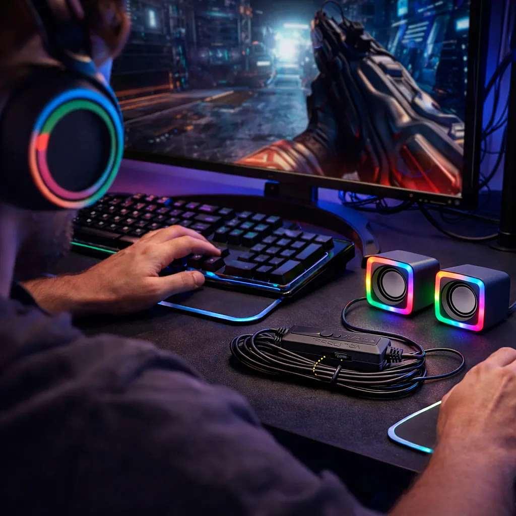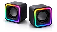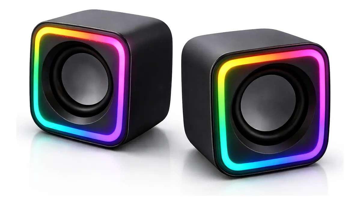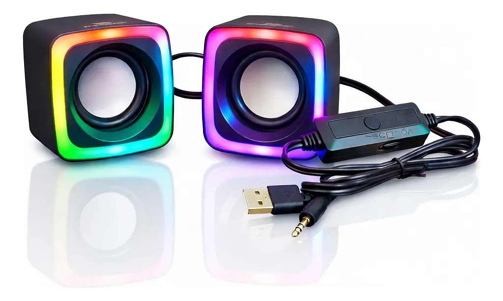 Design gamer compacto com iluminação RGB Som estéreo para maior imersão nos jogos Controle de volume integrado Conexão simples via entrada AUX Ideal para PCs, notebooks e setups gamers Ocupa pouco espaço na mesa