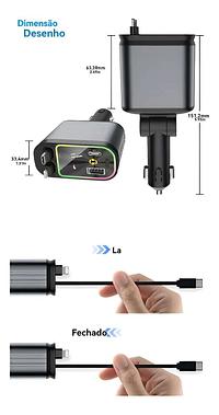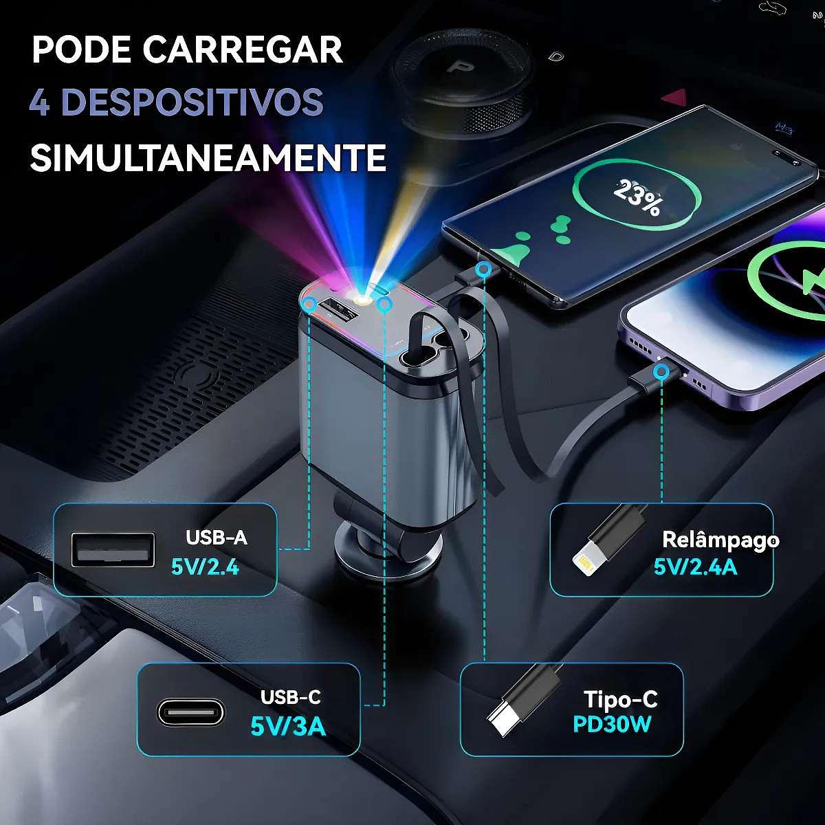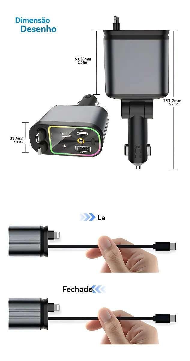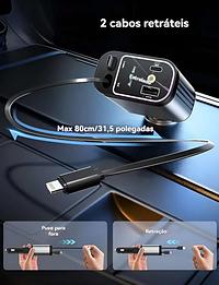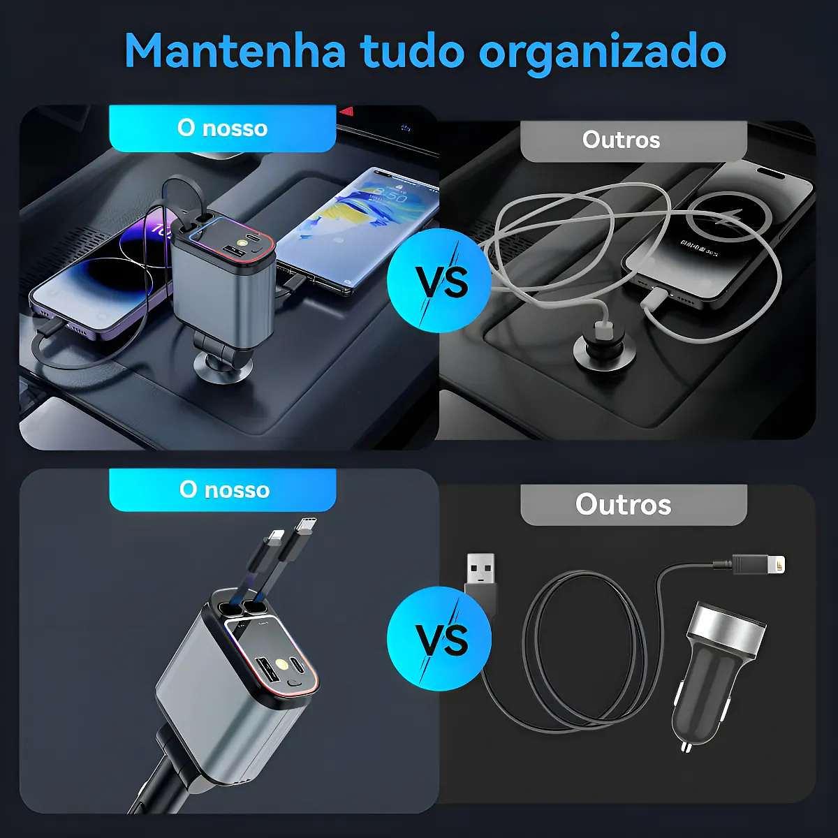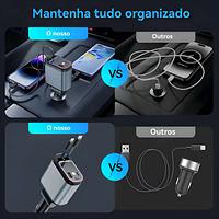 Recolhimento automático dos cabos do carregador. Os cabos podem ser retraídos automaticamente após o uso para armazená-los convenientemente. Basta puxar duas vezes ou até o final e o cabo retornará à sua posição. Cabos emaranhados no console do carro nunca mais.