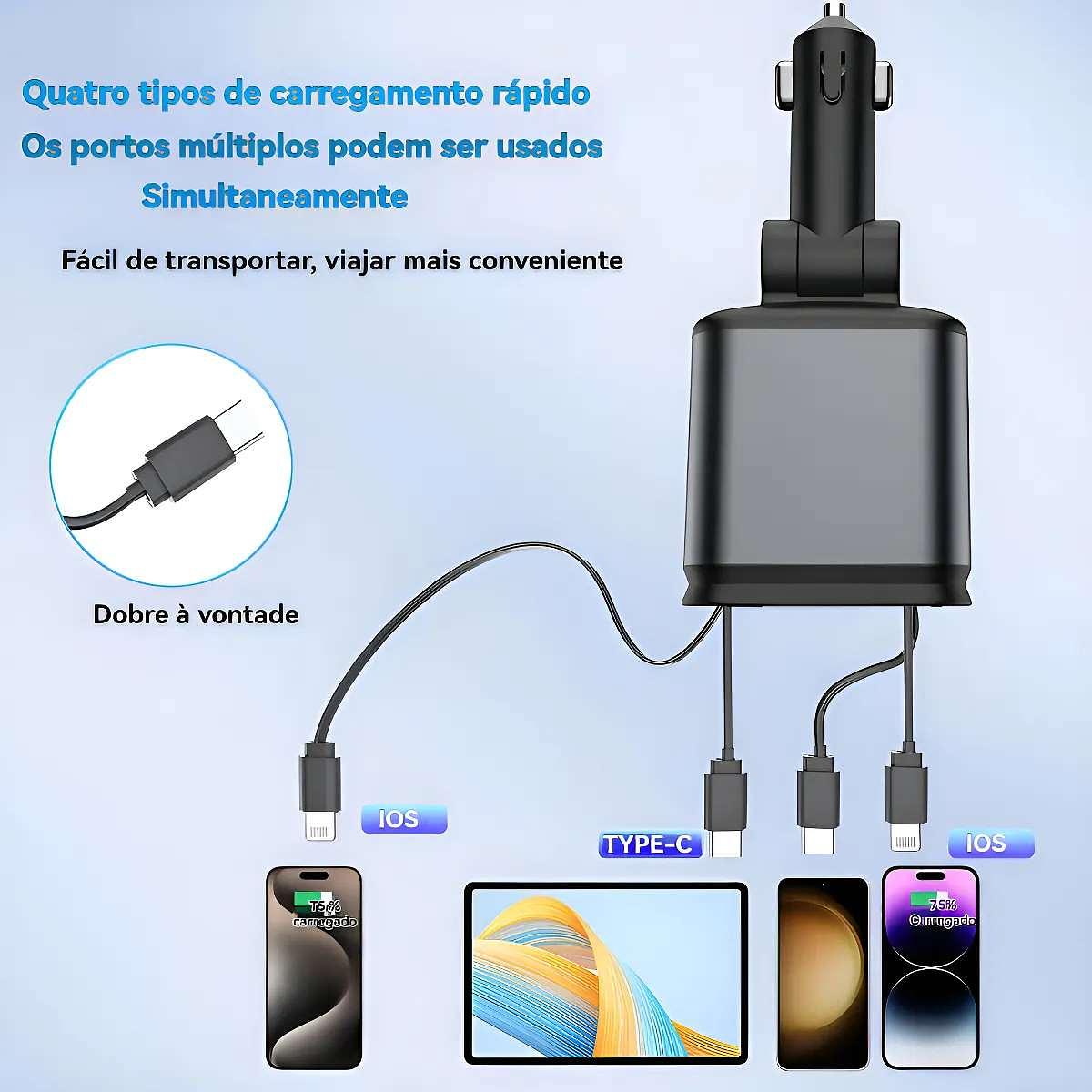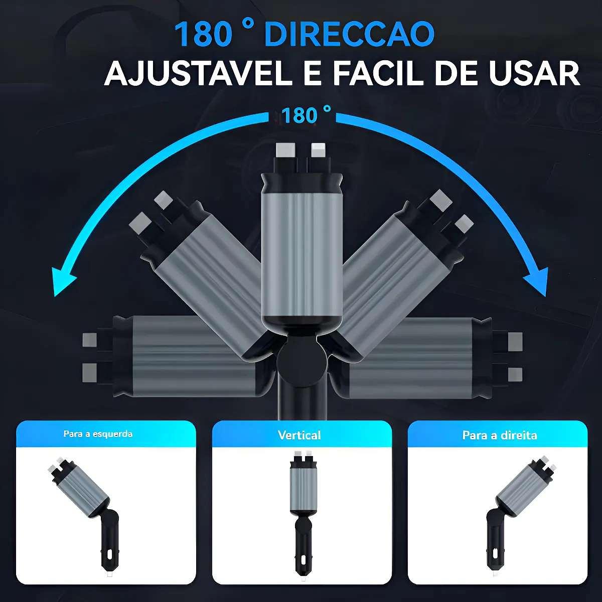 Carregador veicular Super Fast Charge retrátil e articulado. Diga adeus ao carregamento lento em seu carro. Este carregador veicular possui tecnologia avançada que permite carregar rapidamente dispositivos USB com iOS e Android. Este carregador que seus dispositivos permaneçam carregador em alta velocidade.