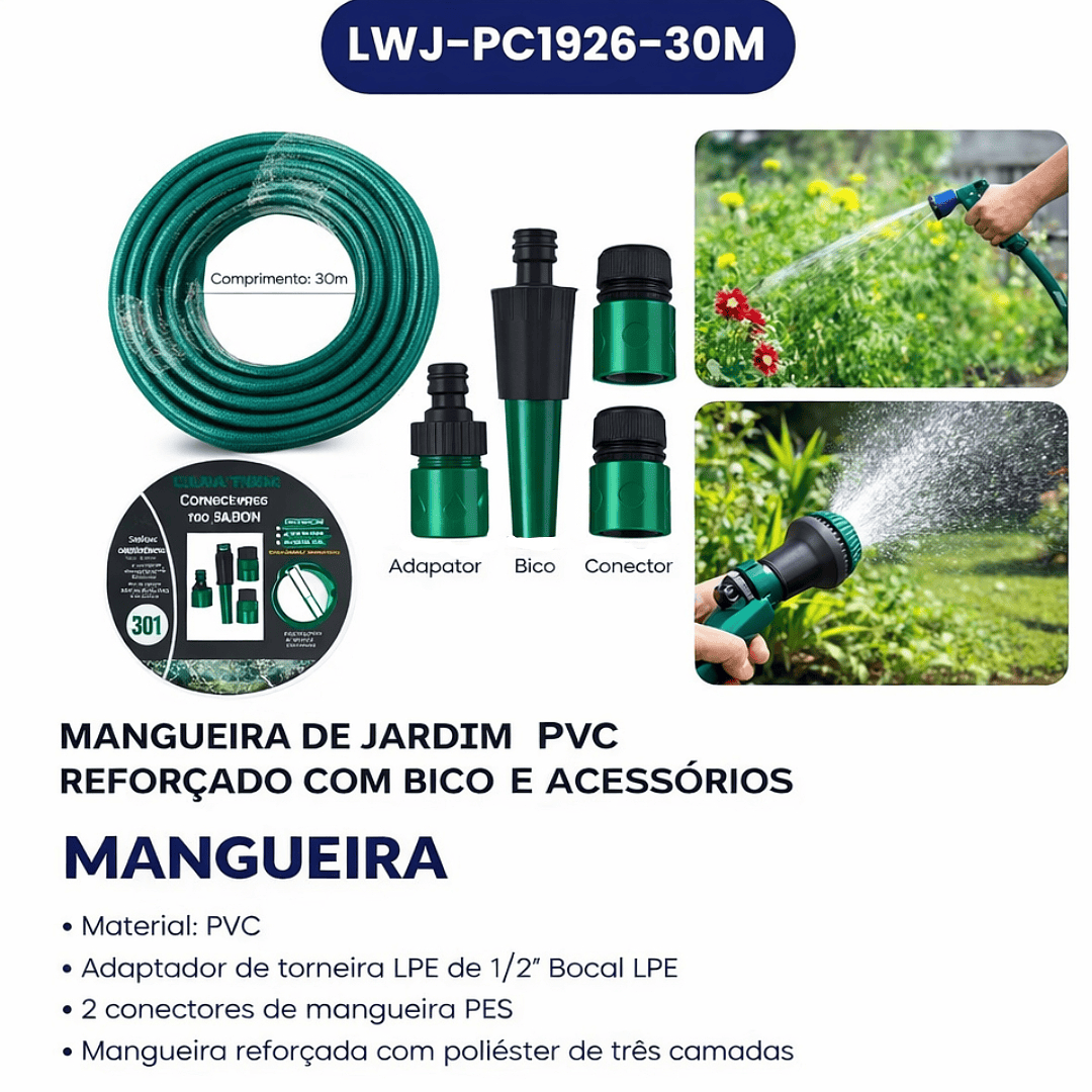 Mangueira de Jardim 30 Metros PVC Reforçado com Bico e Acessórios