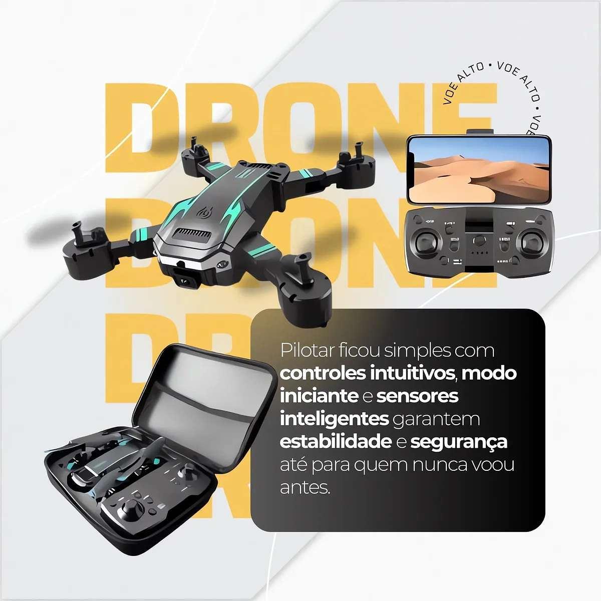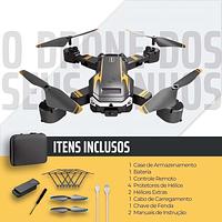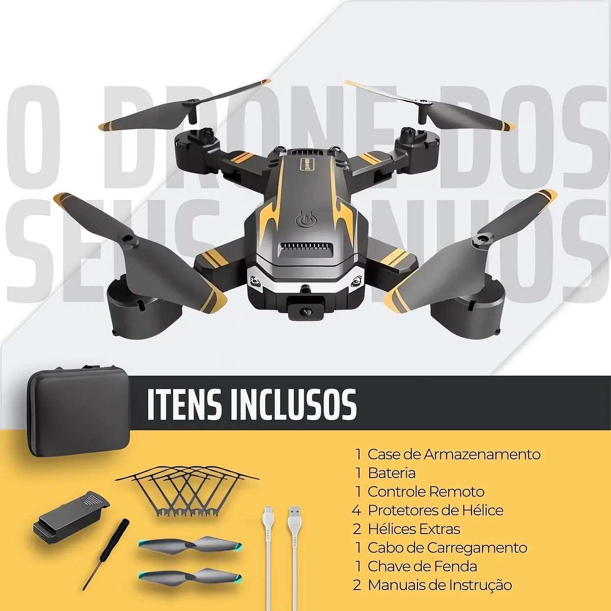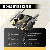 Drone S6 Pro dobrável com câmera dupla HD; indicado para quem busca estabilidade, praticidade e imagens de alta definição; possui transmissão ao vivo via Wi-Fi 5G com baixa latência; conta com zoom digital 50 vezes; sensor de altitude para voo estável; desvio inteligente de obstáculos por sensor frontal; iluminação LED para voos noturnos; decolagem e pouso automáticos; retorno com um toque; voo por trajetória desenhada no aplicativo; comandos por gestos para fotos e vídeos; acrobacias 360 graus; design dobrável com case para transporte.