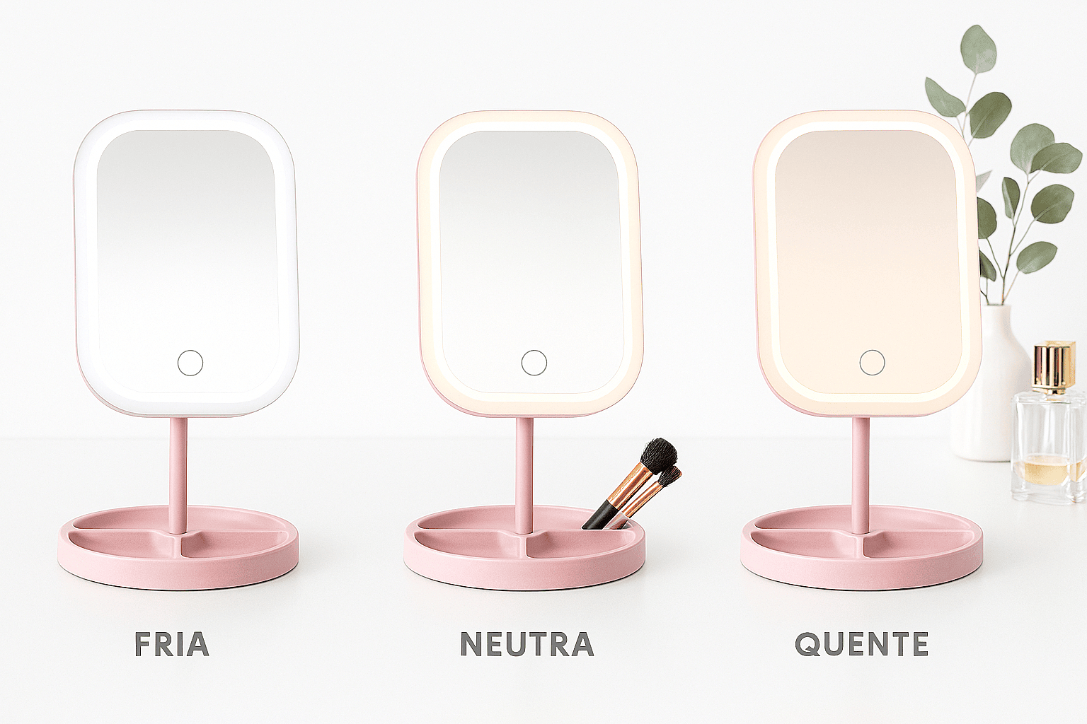 Seu design sofisticado em rosa claro combina com qualquer decoração, enquanto a base organizadora permite armazenar pincéis, acessórios ou cosméticos de forma prática. A inclinação ajustável garante o ângulo ideal e o toque sensível na tela torna a troca de luz simples e intuitiva.