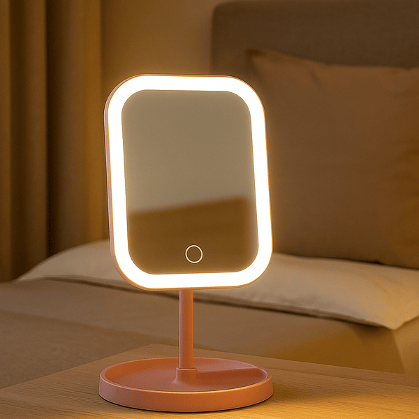 Espelho de Mesa LED B-MAX com 3 Tonalidades de Luz, Inclinação Ajustável e Base Organizadora – Rosa Elegante