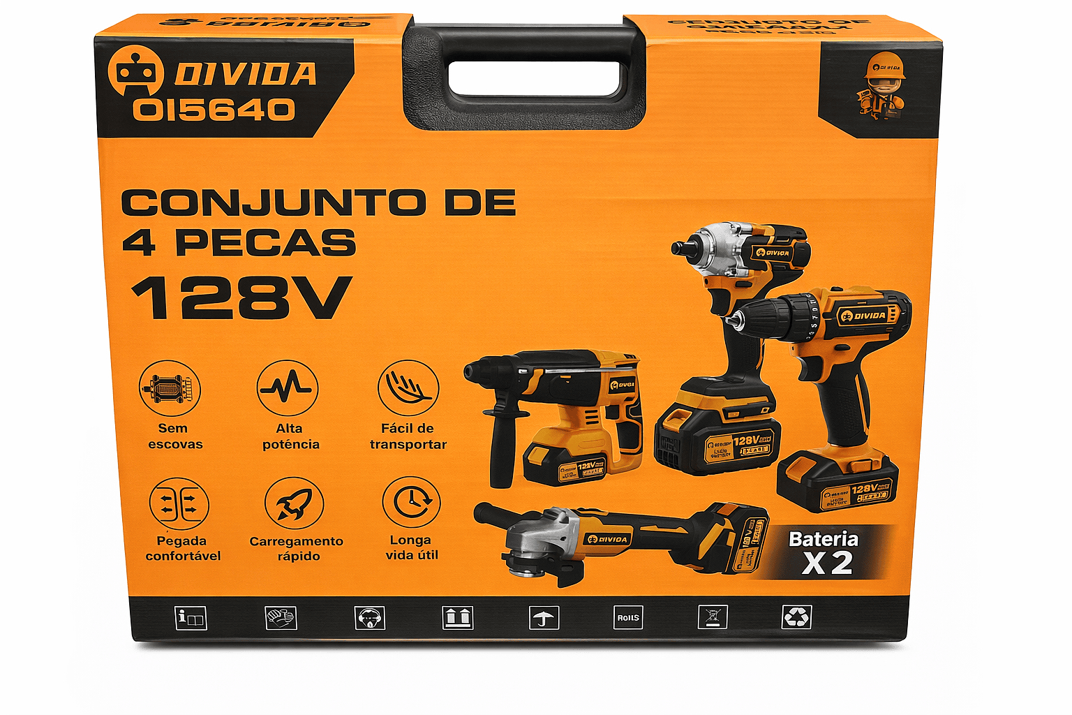 Acompanha kit completo de acessórios, incluindo 2 baterias, garantindo maior autonomia e produtividade no trabalho.