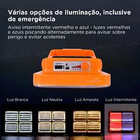 Possui 5 níveis de iluminação ajustáveis, além de modo flash vermelho e azul, ideal para sinalização ou situações de emergência.