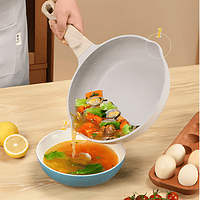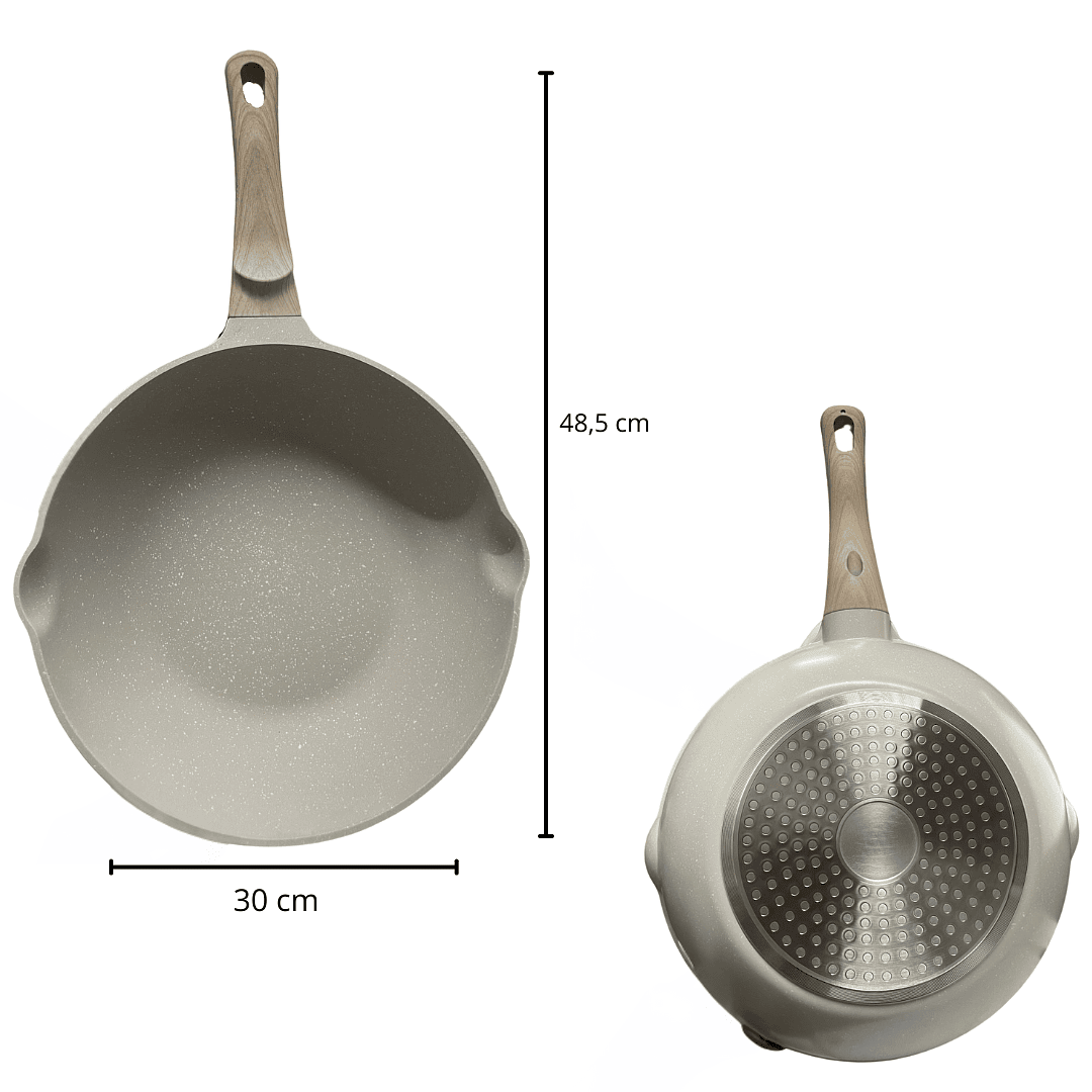 É feito de ferro forjado e revestido com pedra médica natural. As panelas antiaderentes atualmente no mercado são revestidas. A principal razão é se o material é seguro. O revestimento antiaderente é uma pedra médica natural e é feito de antiaderente de alta qualidade e seguro A camada, não contém FPA, é não-tóxico e inofensivo para o corpo humano, e pode ser usado com confiança, e a panela antiaderente não tem fumaça de óleo, condução de calor, fácil de limpar, eficiente em termos de combustível, e luz. Esta é a característica da nossa cozinha.