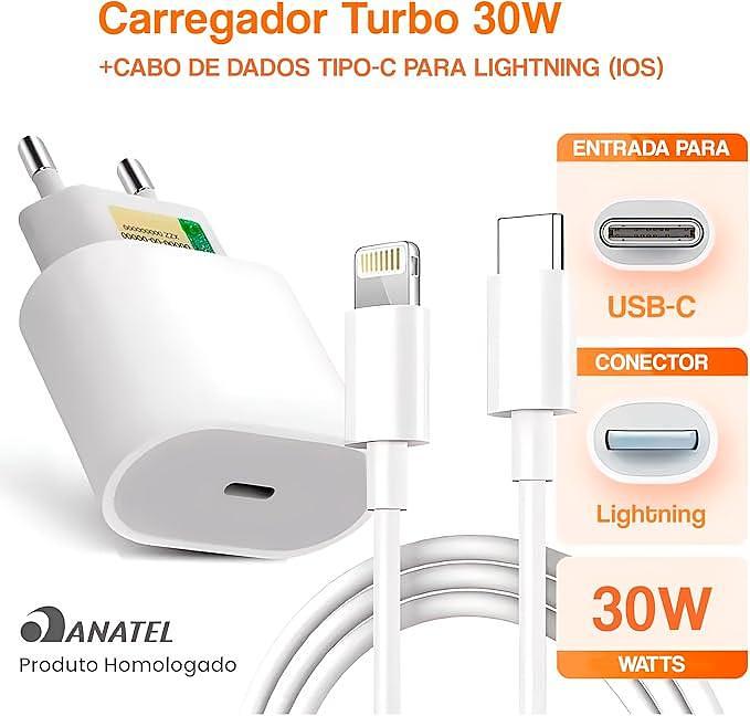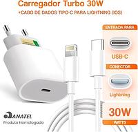 Carregador Turbo 30W A`Gold compativel Cabo Tipo C p/LIGHTNING O adaptador de energia USB-C te oferece uma recarga rápida e eficiente. É ideal para usar em casa, no trabalho ou onde você estiver. Ele é compatível com qualquer aparelho. Possui tecnologia Power Delivery (PD), que é uma especificação para lidar com maior potência e permite que uma variedade de dispositivos carregue rapidamente por meio de uma conexão USB-C. Ele identifica o dispositivo conectado, para entregar a quantidade correta de energia para carregar o aparelho o mais rápido possível. Isso garante carregamento rápido e sem enviar mais energia da qual pode danificar o aparelho. ESPECIFICAÇÕES Carregamento Turbo 30W Tensão de Entrada: 100-240 V Tensão de Saída: 5V Corrente de Saída: 3A CABO DE CARREGAMENTO RÁPIDO E DADOS USB-C PARA LIGHTNING Com este cabo para USB-C você vai carregar o seu smartphone com o dobro da velocidade que você carrega com o cabo convencional. O cabo Lightning tipo-C com 1 metro de comprimento, foi desenvolvido para sincronizar/carregar da melhor forma o seu smartphone e qualquer outro aparelho com entrada Lightning. Ter um cabo Lightning com o novo conector tipo C proporcionará uma conexão segura do seu celular com qualquer computador de entrada tipo-C, sincronize e recarregue os dados do seu aparelho de forma rápida e segura. Recarregue o seu celuar om o cabo Lightning tipo C usando o adaptador de energia de entrada tipo C, PACOTE INCLUI 1x CARREGADOR ADAPTADOR DE ENERGIA 30W 1x CABO DE CARREGAMENTO RÁPIDO E DADOS USB-C PARA LIGHTNING