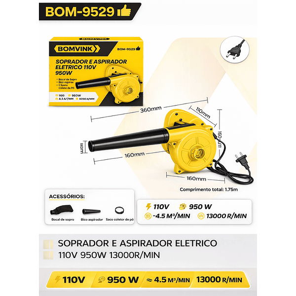 Soprador e Aspirador Elétrico BOMVINK 950W – Potência e Versatilidade em um Só Produto -------------------------------------------------------------------- Mantenha suas áreas sempre limpas com o Soprador e Aspirador Elétrico BOMVINK. Combinando força e funcionalidade, ele é ideal para quem busca praticidade na remoção de sujeira em jardins, oficinas, garagens e outros espaços externos. 2 em 1: Sopra e Aspira com Eficiência Equipado com motor de cobre puro e 950W de potência, este equipamento oferece desempenho confiável tanto para soprar folhas e resíduos quanto para aspirar sujeiras, agilizando suas tarefas com facilidade. -------------------------------------------------------------------- Especificações Técnicas: - Modelo: BOM-9528 - Voltagem: 110V - Frequência: 50Hz/60Hz - Potência: 950W - Motor: Cobre puro - Velocidade máxima do vento: 4,5m³/min - Rotação: 13.000 RPM - Dimensões: 17 x 17 cm (AxL) - Peso: 1,1 kg -------------------------------------------------------------------- Conteúdo da Embalagem: - 1 Soprador Elétrico - 1 Sacola de sucção - 1 Tubo de sopro - 1 Anel de fixação - 1 Manual de instruções -------------------------------------------------------------------- Este é o equipamento ideal para quem precisa de uma solução prática e potente na limpeza de ambientes. Leve, ergonômico e com ótimo desempenho, o BOMVINK entrega resultado profissional com conforto e agilidade.