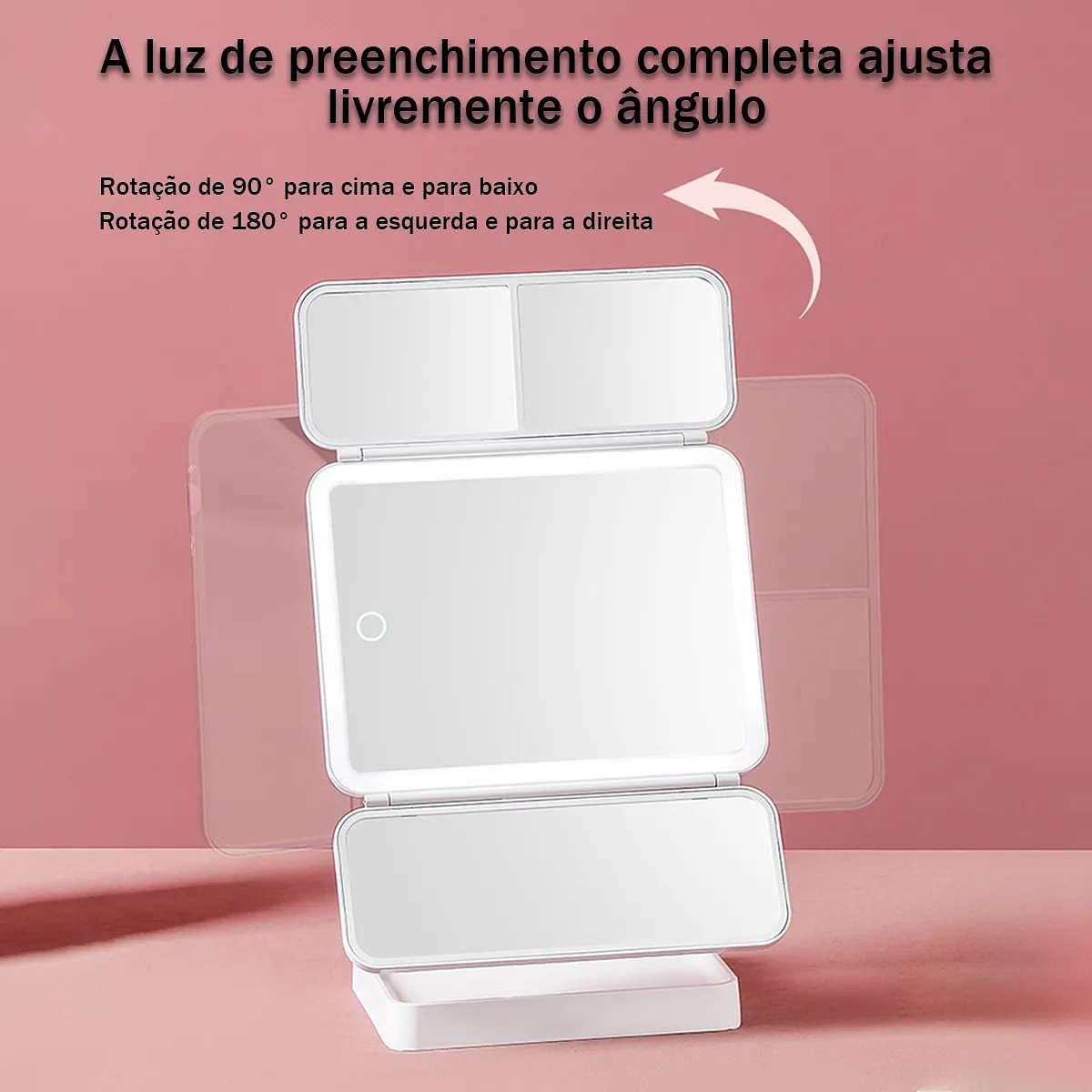 Iluminação completa e ângulo ajustável: o espelho pode ser ajustado 90° para cima e para baixo e 180° de um lado para o outro, permitindo uma aplicação confortável da maquiagem sem se abaixar.