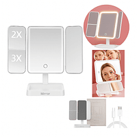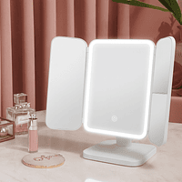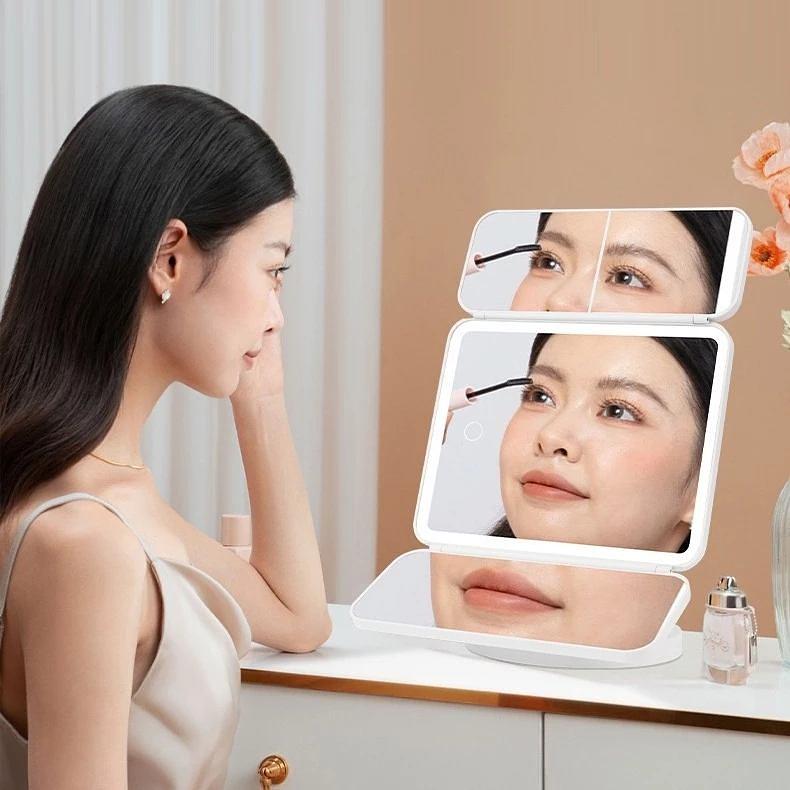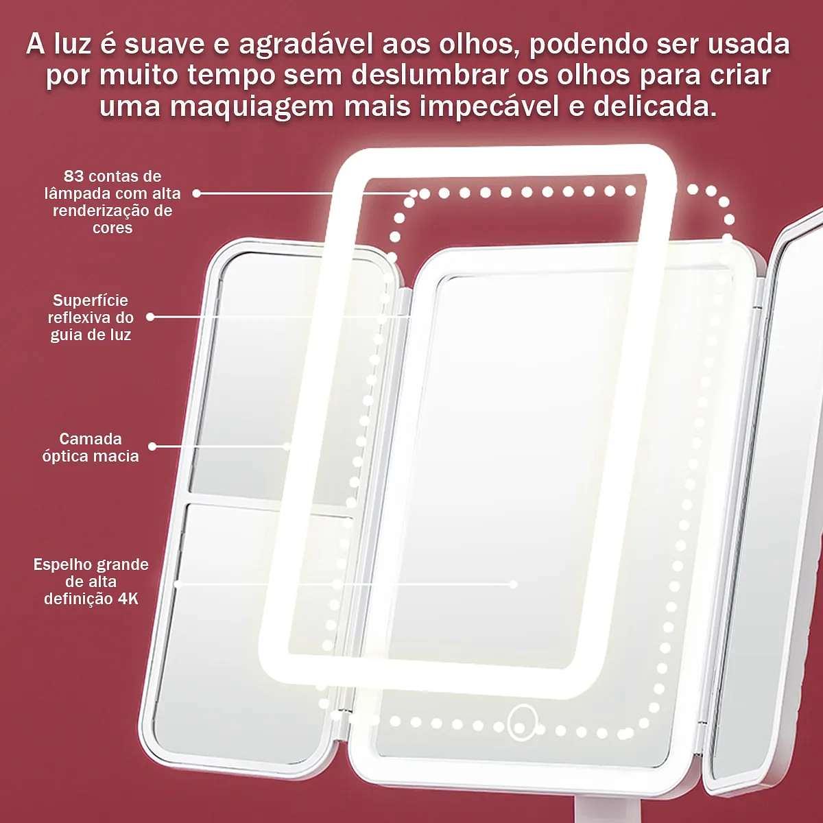 Design dobrável de espelho triplo: o espelho tem portas duplas e pode ser dobrado para evitar poeira. Feito de ABS fosco com base removível para fácil armazenamento e transporte, e permite ajustes de ângulo livre.