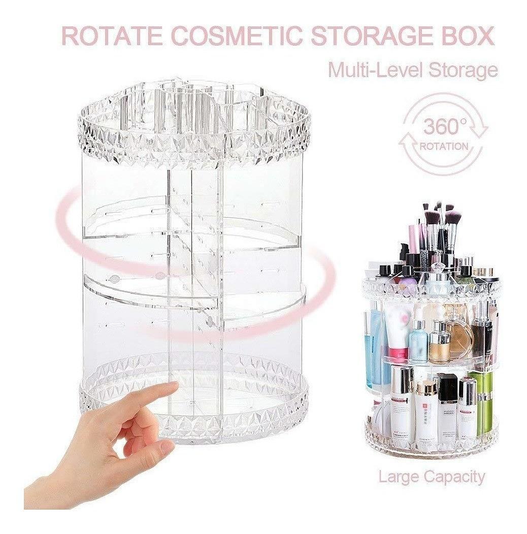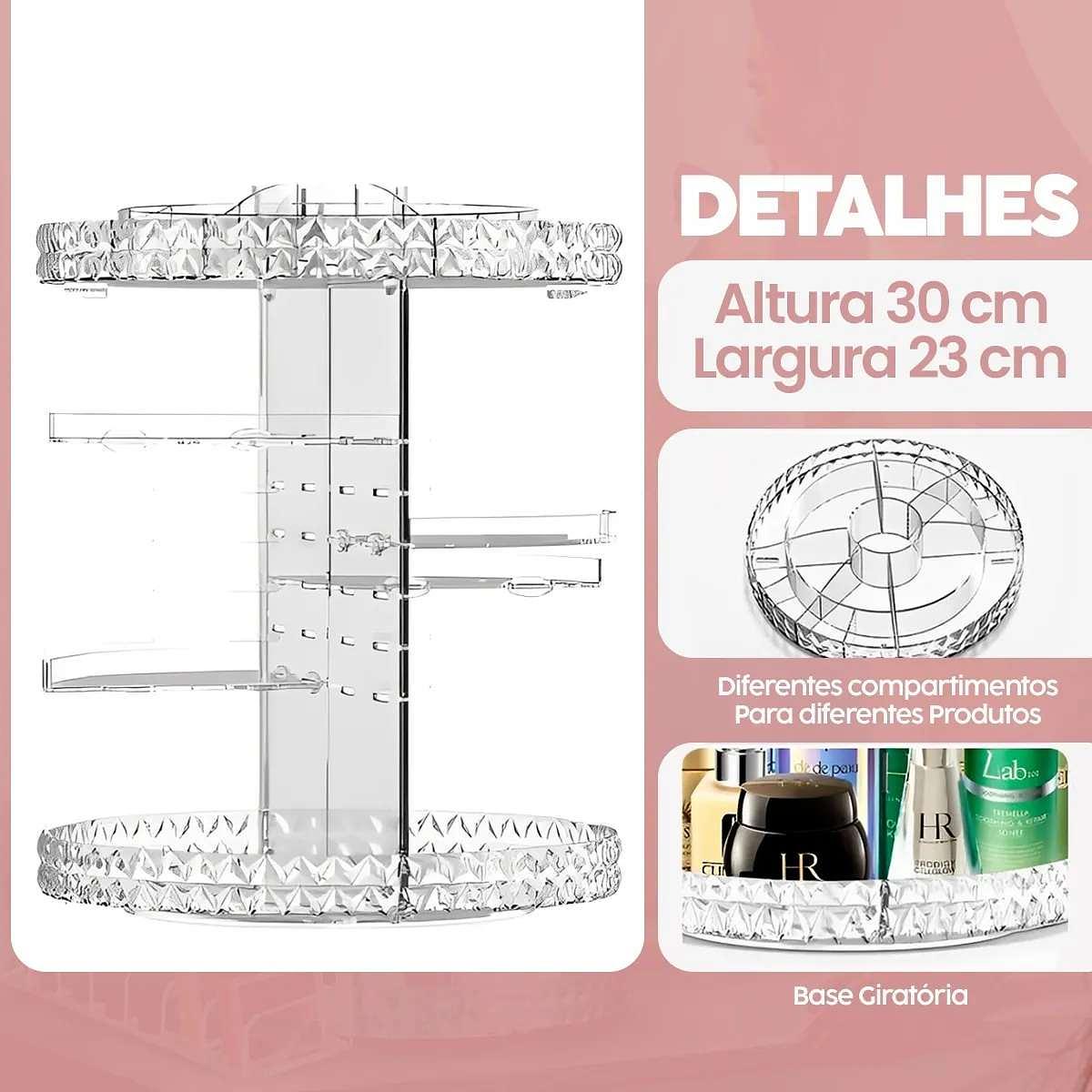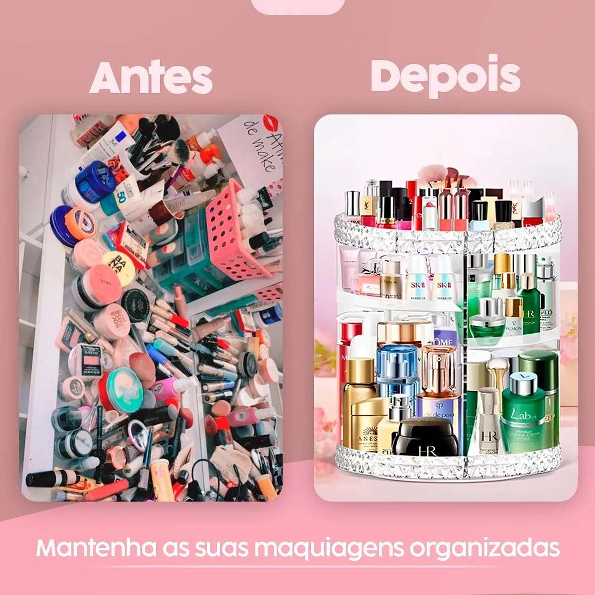 O Organizador de Maquiagem Acrílico 360 foi desenvolvido com alto padrão de qualidade, visando garantir praticidade e organização de todos os cosméticos e itens de maquiagem para salões, casas etc. O produto apresenta design moderno, duas gavetas e bandeja com várias divisórias para acomodar lápis de olho, rímel, batons e também pode ser utilizado como Porta Joias, porta cosméticos, perfumes, e o que mais sua imaginação permitir.