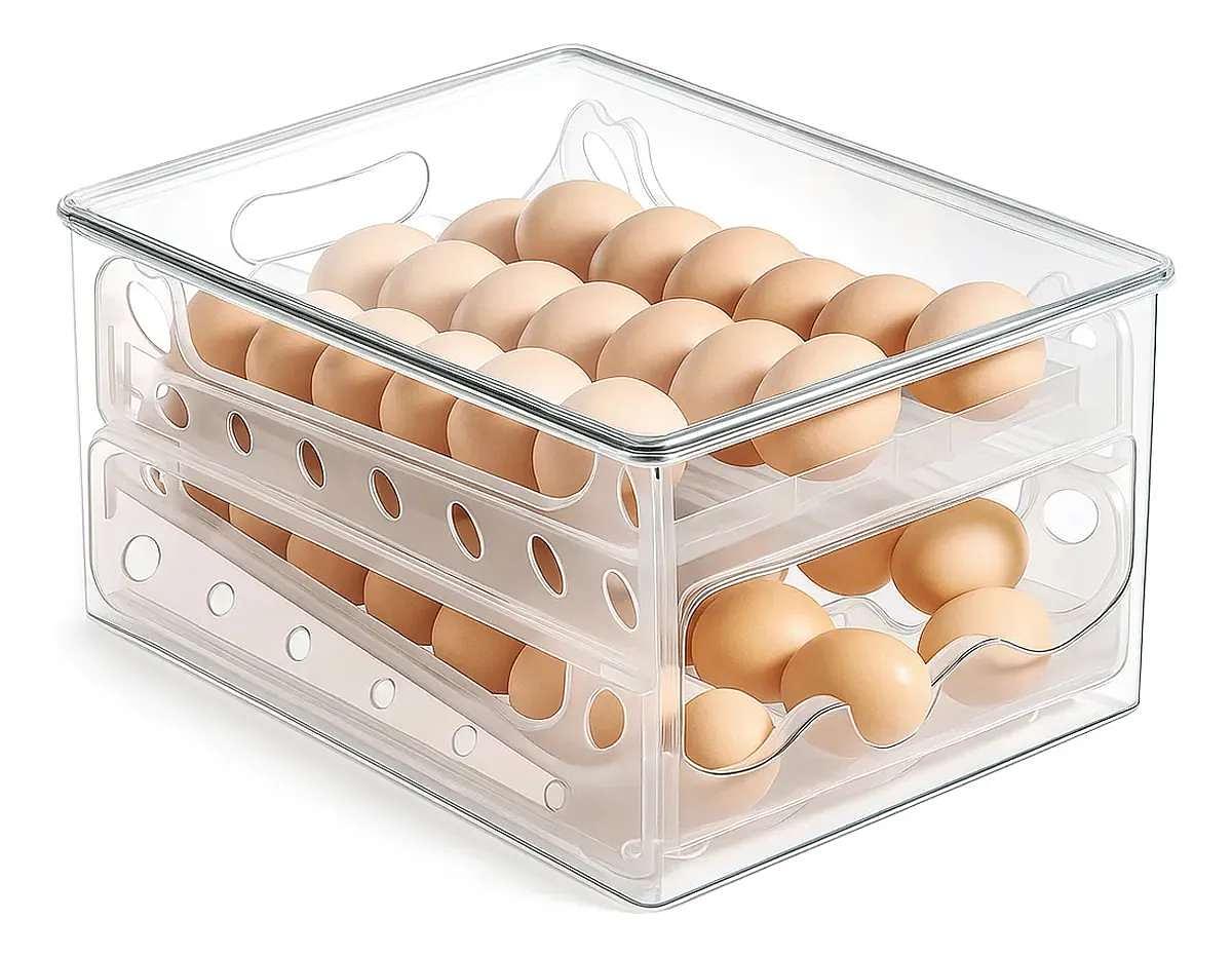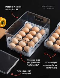rganizador acrílico multiuso para geladeira, com suporte de 2 andares para ovos com rolagem automática. Permite uso para ovos, latas e outros alimentos. Material transparente, resistente e de fácil limpeza, ideal para manter a geladeira organizada e funcional.