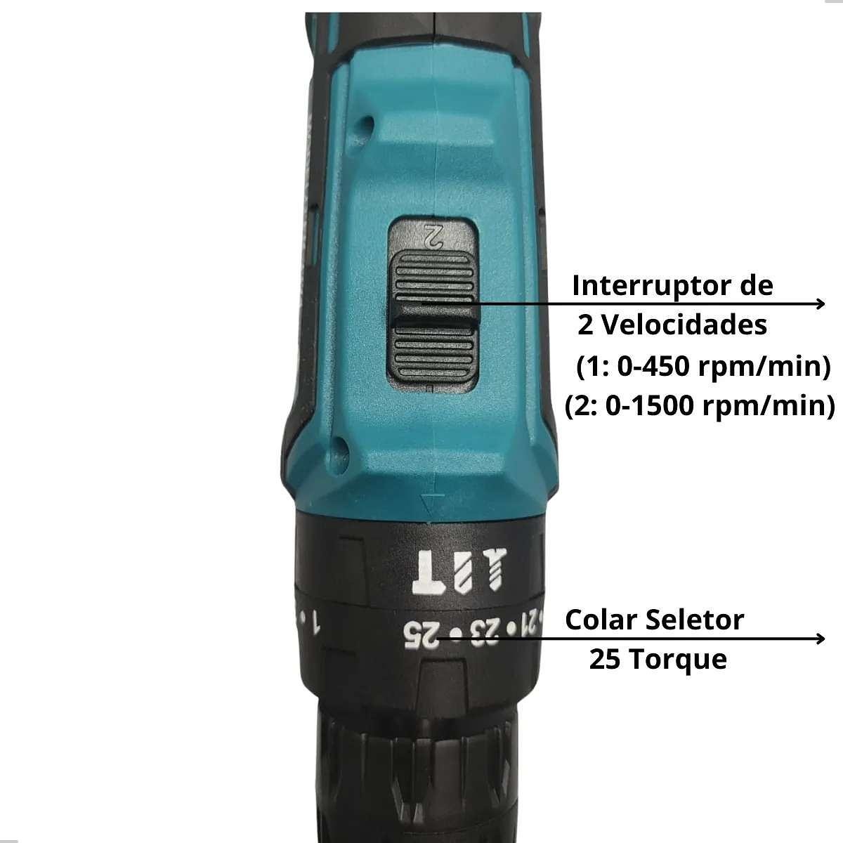 Ajuste de Torção: Possui 25 engrenagens de ajuste, permitindo a aplicação do torque ideal para cada tipo de material e tarefa.