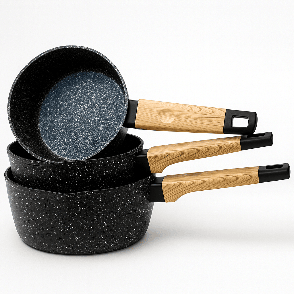 Eleve sua cozinha ao nível profissional com este conjunto de panelas antiaderentes com revestimento nano-granito. Três tamanhos essenciais (16, 18 e 20 cm) para absoluta versatilidade: ligue o fogo, escolha a medida ideal e cozinhe com estilo, eficiência e o mínimo de óleo. O acabamento em granito entrega visual sofisticado + desempenho premium. Um investimento inteligente para quem valoriza resultado e beleza na cozinha.