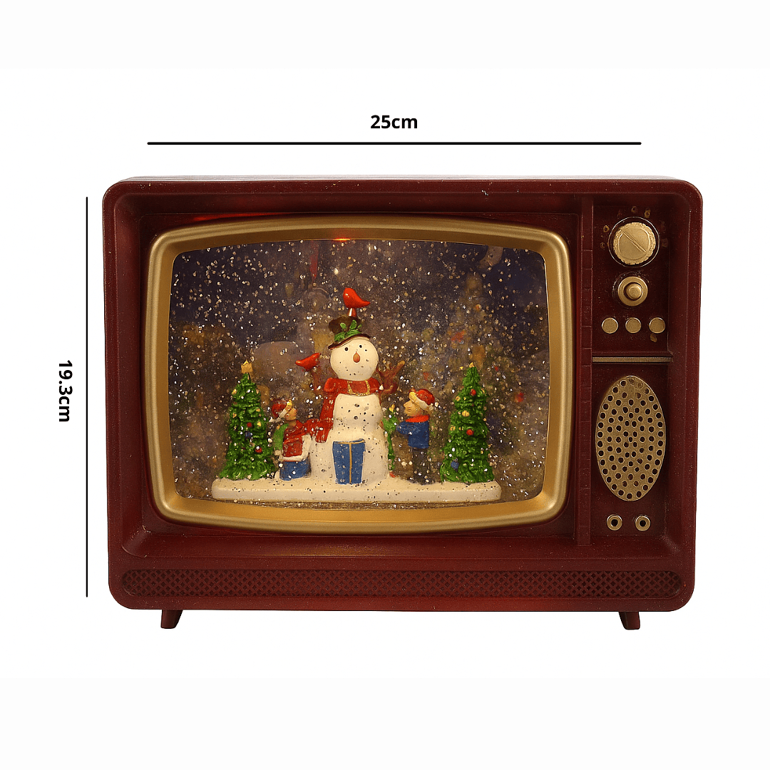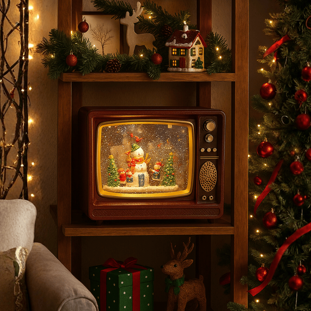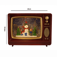 Encante sua decoração de Natal com esta charmosa luminária em formato de TV retrô, que combina iluminação suave, movimento e música! Ao ligar, a neve começa a girar em torno do boneco de neve e das pequenas árvores iluminadas, criando um lindo espetáculo natalino.