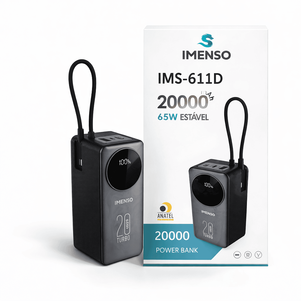 Capacidade: 20.000 mAh.Potência: 65W, suportando carregamento rápido e estável.Recursos: Possui visor digital para indicar o nível da bateria e alça para transporte.Compatibilidade: Adequado para carregar celulares, tablets e notebooks.