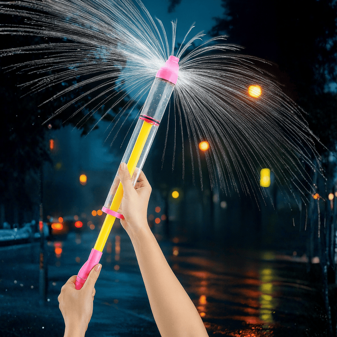 A Pistola de Água Fogos de Artifício dispara jatos em formato de explosão, criando um efeito incrível que lembra um show de luzes no céu – mas feito de água!