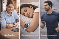 Notificações e Controle: Notificações de chamadas e mensagens (WhatsApp, Instagram etc.) , Controle de músicas do celular, Alarme e lembretes.