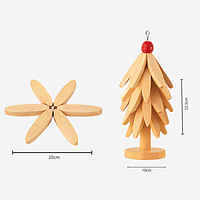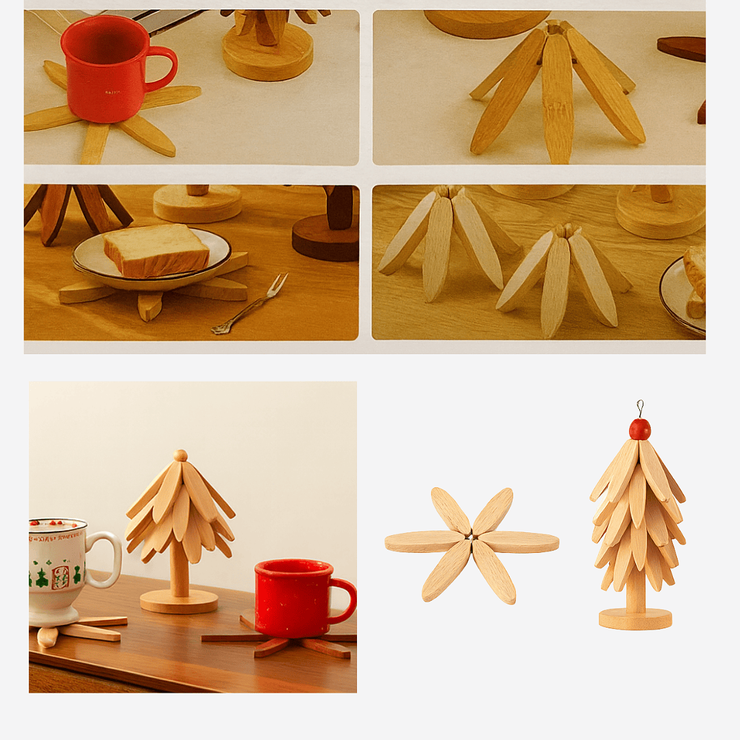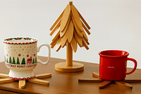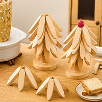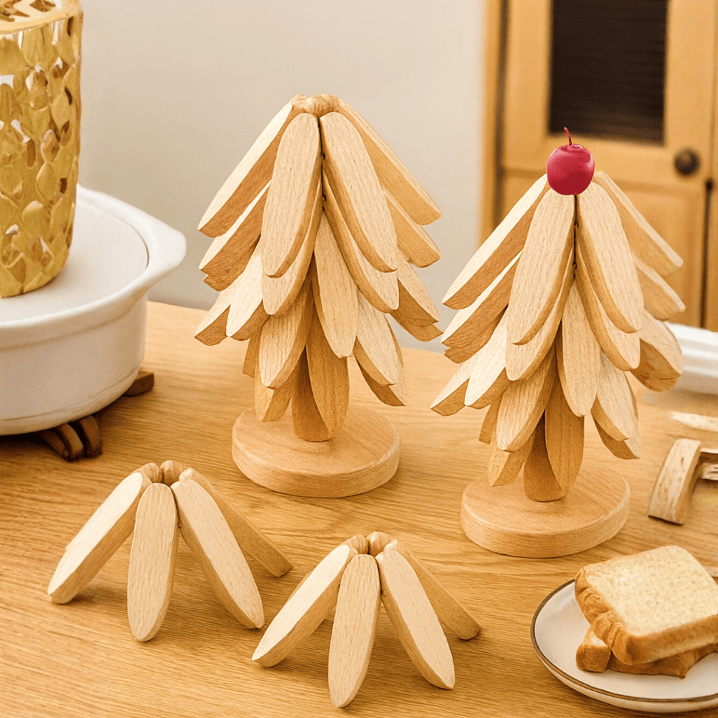 Este descanso de mesa é um acessório decorativo em formato de pinheiro, confeccionado em madeira natural com acabamento liso e sofisticado.