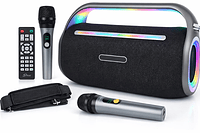 Possui 2 microfones sem fio inclusos, perfeita para karaokê, apresentações ou eventos.