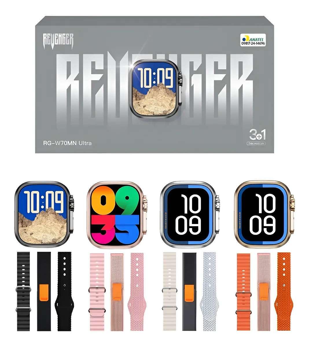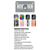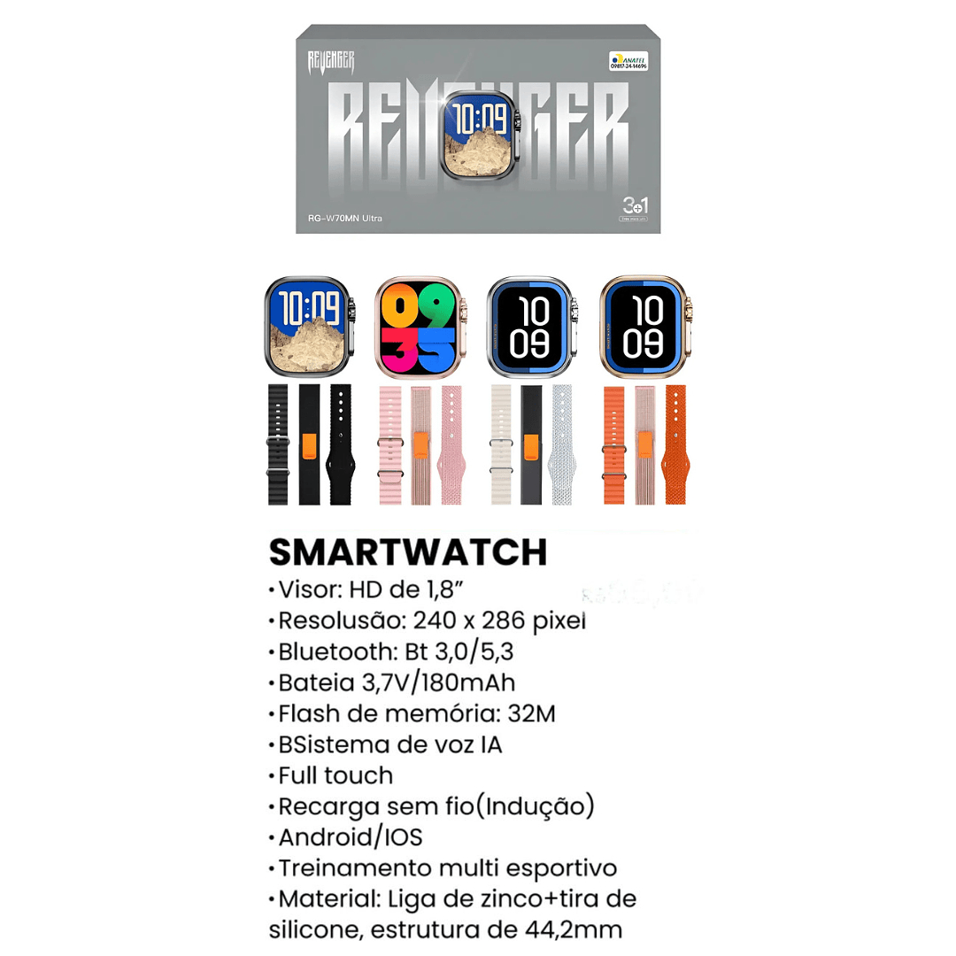 Descubra o smartwatch Revenger RG-W70MN Ultra, um dispositivo que combina estilo e funcionalidade em um design moderno de 44,2 mm. Com uma tela de 1,8 polegadas, este smartwatch é ideal para quem busca acompanhar sua saúde e atividades diárias de forma prática e eficiente. Equipado com funções como assistente de ciclo menstrual, monitoramento de temperatura corporal, registro de chamadas e medição de saturação de oxigênio no sangue, ele se torna um aliado indispensável para o seu bem-estar. Além disso, possui modos de exercício e jogos, tornando-o perfeito para quem gosta de se manter ativo e entretido. As pulseiras são feitas de silicone, borracha e tecido com velcro, garantindo conforto e versatilidade para o uso diário. O smartwatch é resistente à água, permitindo que você o utilize em diversas situações sem preocupações. Compatível com sistemas operacionais Android e iOS, o Revenger RG-W70MN Ultra oferece conectividade via Bluetooth, facilitando a sincronização com seu smartphone. Disponível em vários idiomas, este smartwatch é uma excelente escolha para quem busca tecnologia e praticidade em um único dispositivo com preço atrativo.